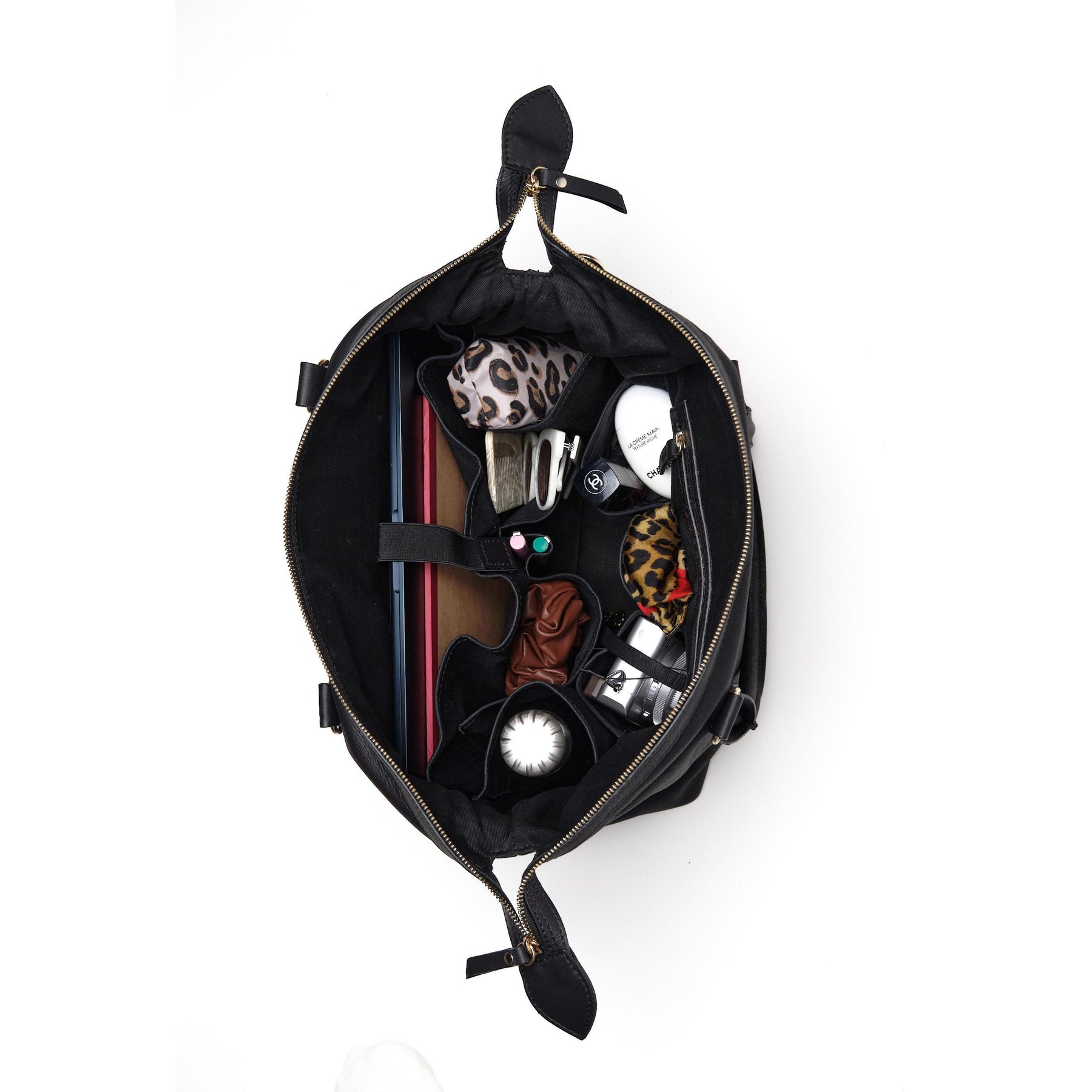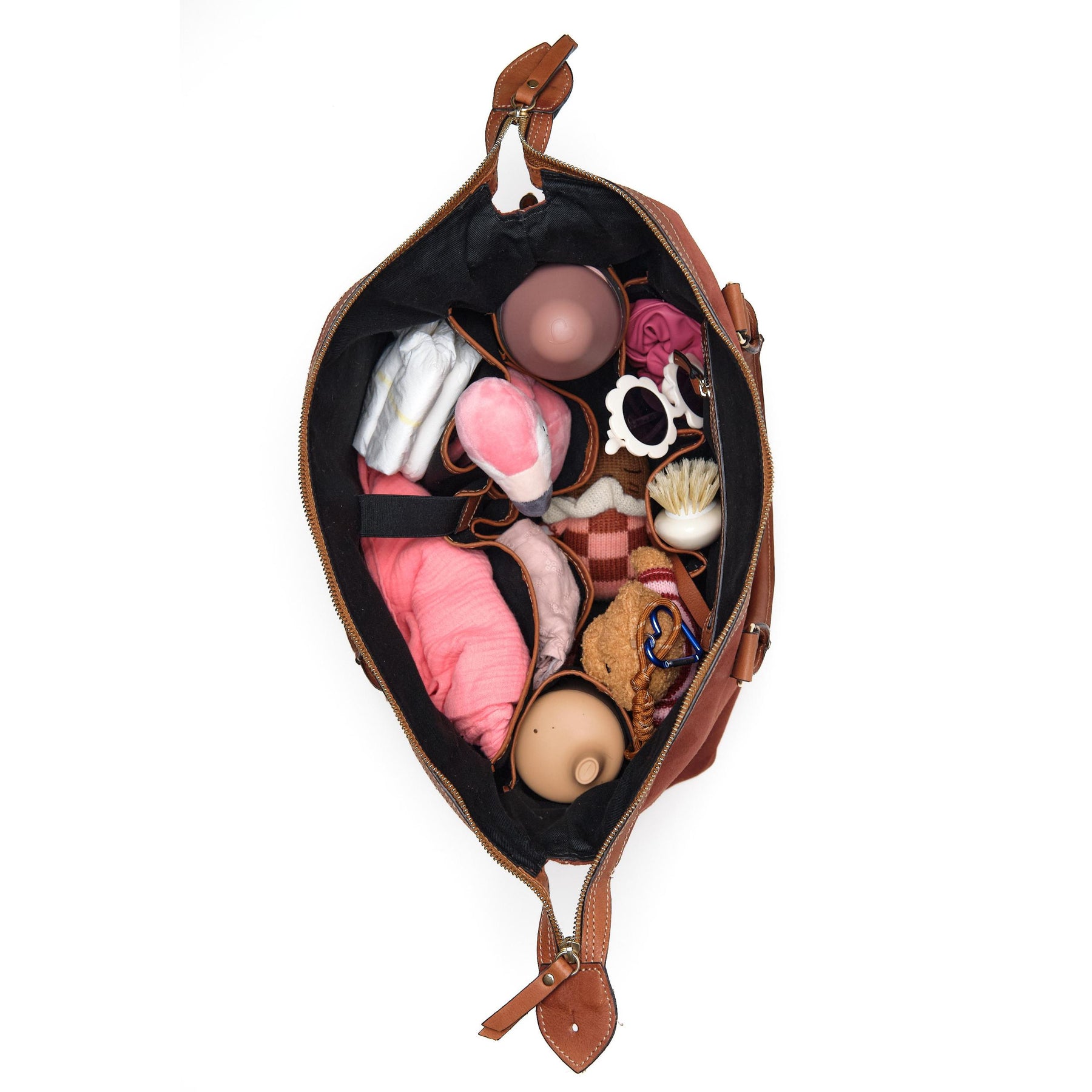 L’intérieur est totalement compartimenté afin d’optimiser le rangement des affaires de bébé et de maman. Il inclut :